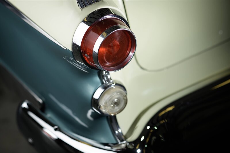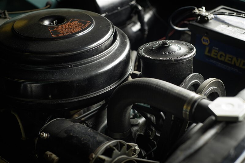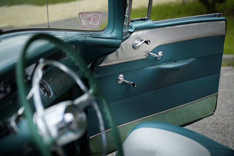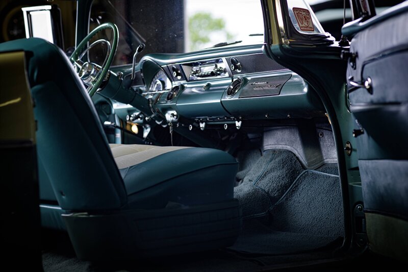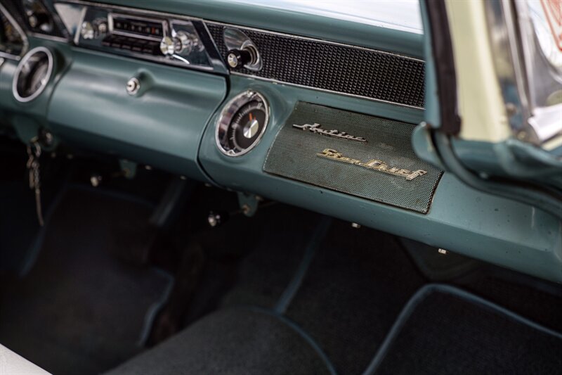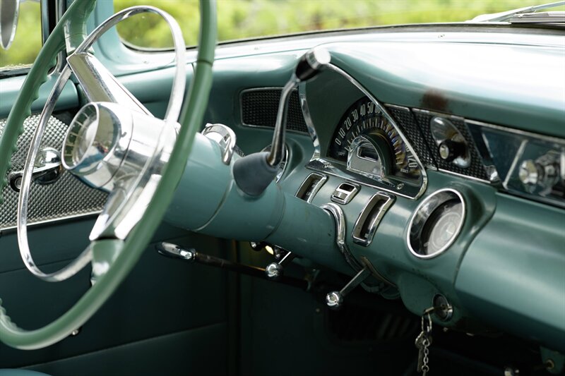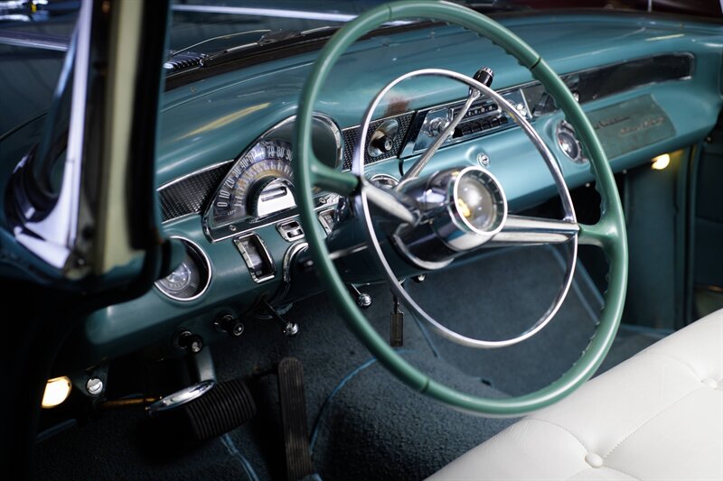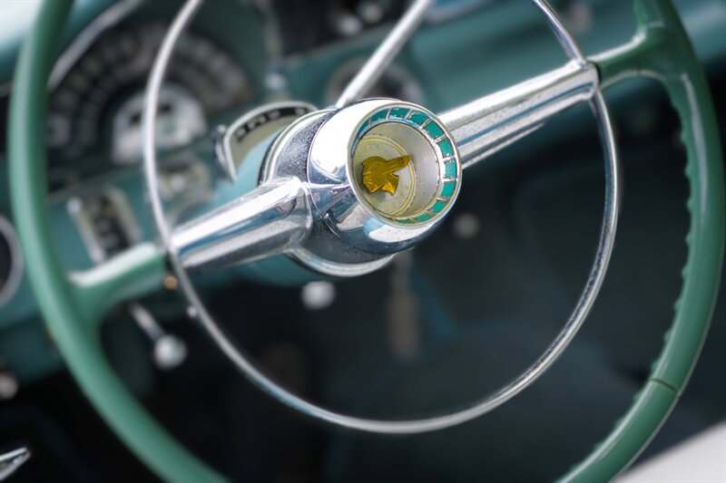 Inside the car sports a striking turquoise vinyl interior with white trim, mirroring the outside well. The front and rear bench seats, the full carpeting and two-tone green steering wheel look great. The matching metal dashboard and the inner door panels are in overall excellent condition. A column-mounted shift lever and a factory AM radio help complete the interior.