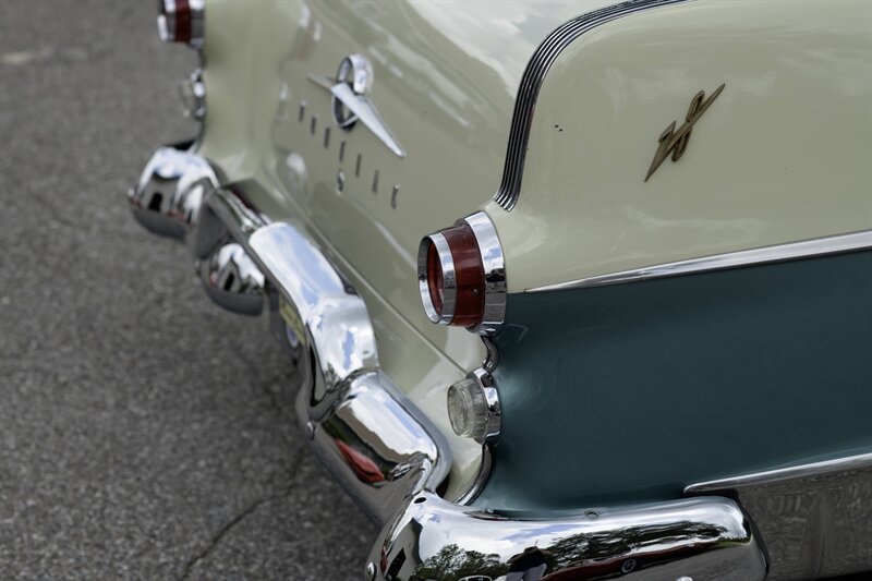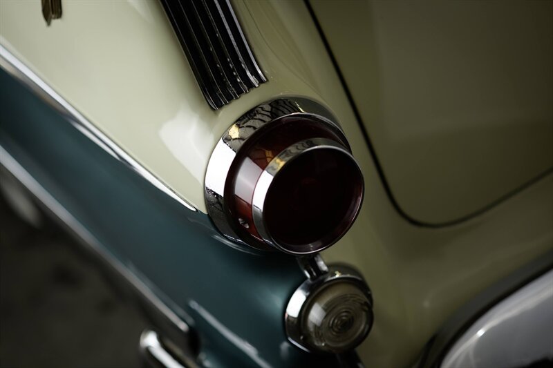 Along with an all-new body, the straight-eight was superseded by the new Strato Streak V-8 power in 1955. Typical for the 1955 Pontiacs is the design with two wide “Silver Streaks” running the length of the hood. The hood ornament “Indian” was amber plastic that lit up when the headlights were turned on.