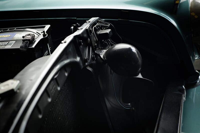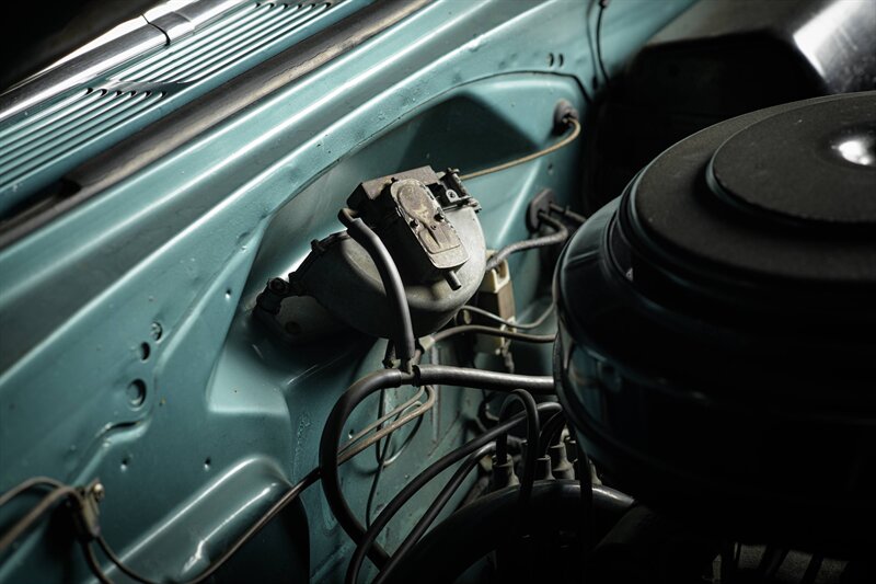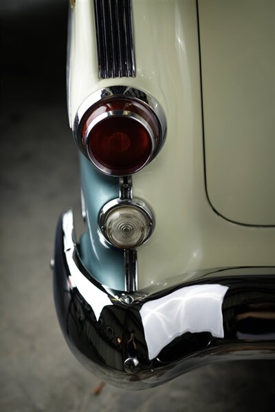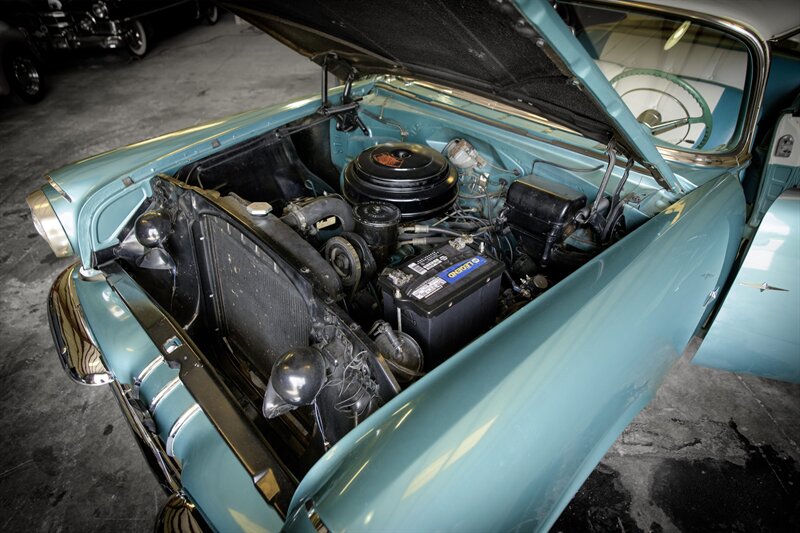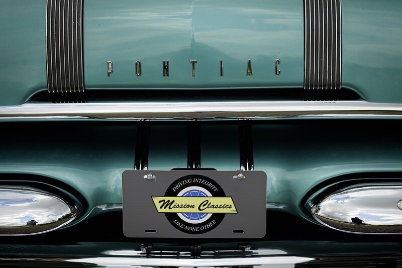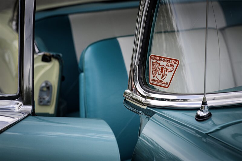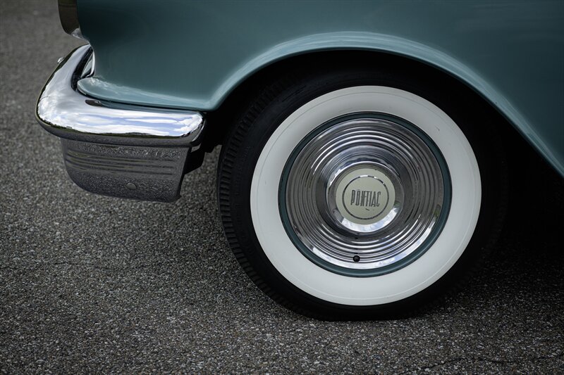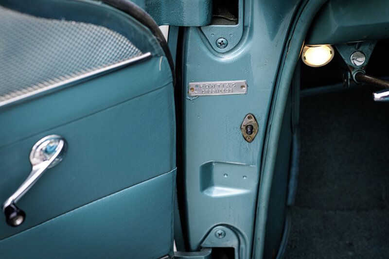 This Pontiac model was made in General Motors’ Southgate, California factory (VIN code C). The two-tone paint is in overall excellent condition, dressed in White Mist over Turquoise Blue (code 62). The chrome bumpers fit tightly to the body, the engine bay is in very tidy order and the cargo area is in very good order and includes a full-sized spare tire and wheel. The Indian Head hood ornament lights up at night. Extra chrome fender skirts and a car cover are included.