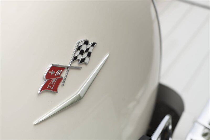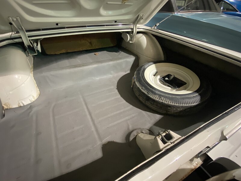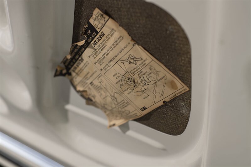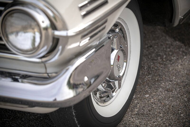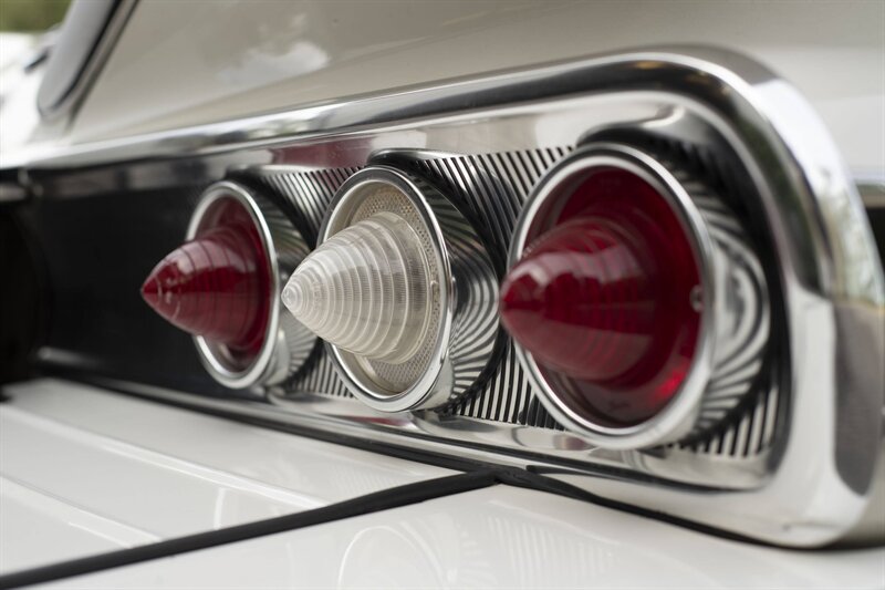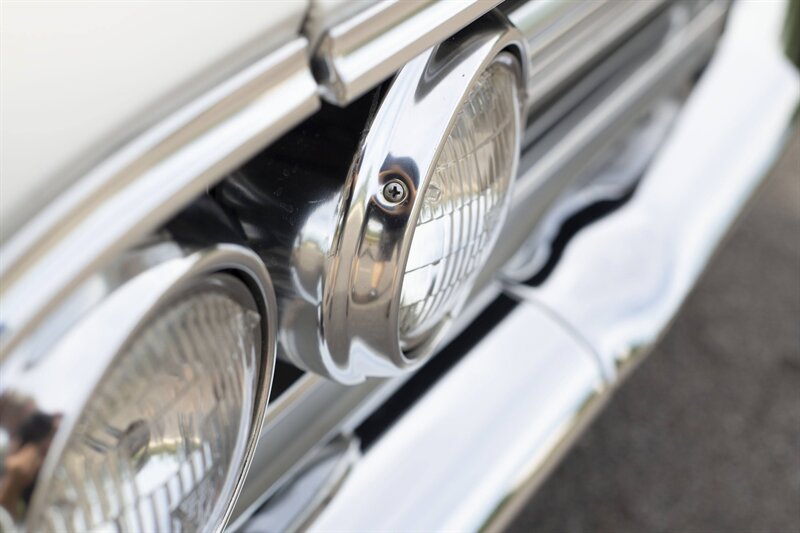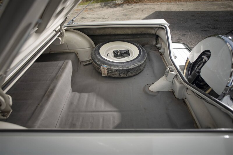 Dressed in Ermine White, (code 936), the car’s paint and trim are in overall excellent condition, including the dual rear antennas, rear fender skirts, dual sideview mirrors, jet-like fender ornaments and rocker moldings. The chrome bumpers fit tightly to the car’s body. In back is a Continental spare tire kit. The engine bay is extremely tide and the trunk’s cargo area is good, original order. All original parts removed are with the car in the trunk.