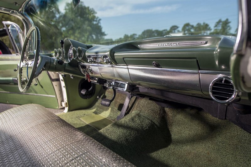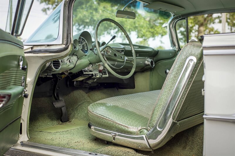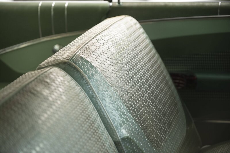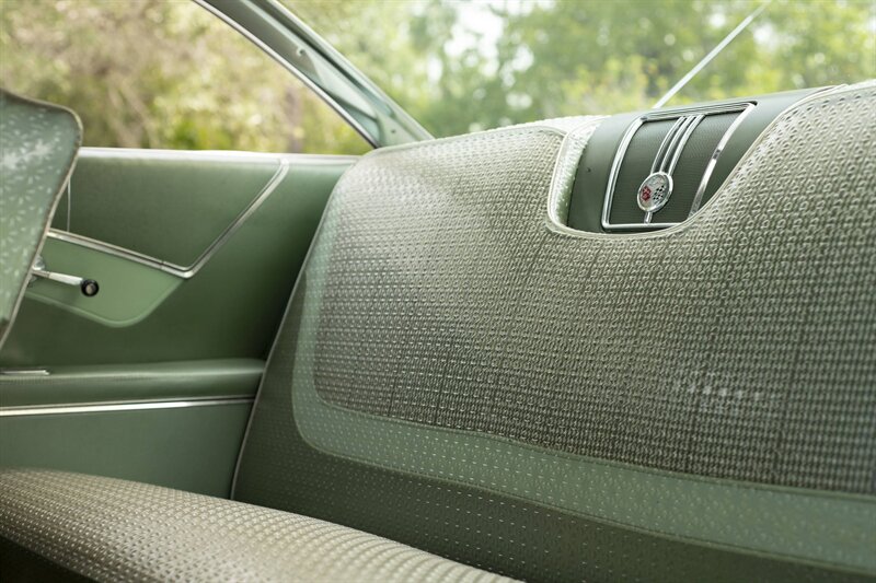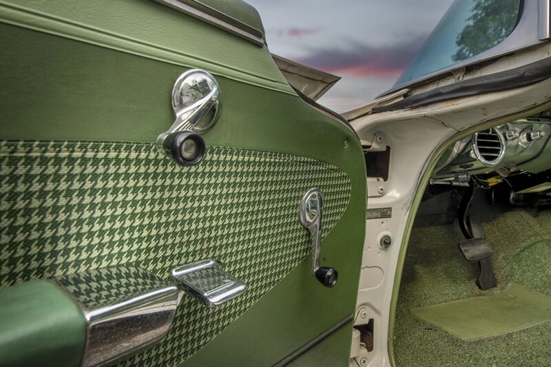Inside, the car is stunning with its green cloth and vinyl interior (code 825) with dealer-installed seat covers on the front and rear bench seats. The green, two-spoke steering wheel with horn ring looks great, setting of the dashboard and its circular gauge pods. The matching green carpeting goes well with the bench seats. A column-mounted shifter and a factory AM radio help complete the interior.