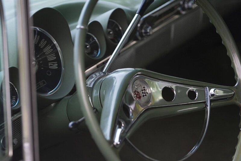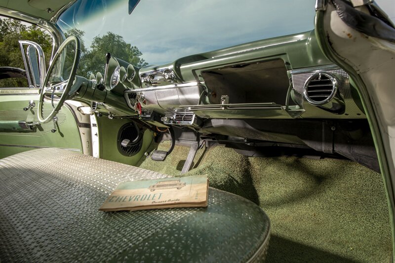 Under the hood is a 283 CID V-8 small block engine matched to a two-speed Powerglide automatic transmission and backed by a 3.36:1 rear end. Driver convenience features include factory air-conditioning (code 4C), power steering, EZ-Eye tinted glass (code EZI) and more.